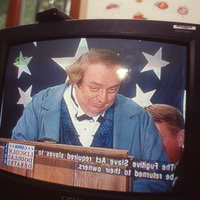 A video screen shows the broadcast of the Lincoln-Douglas Debates, live on C-SPAN, which is featuring a person dressed in a blue 19th-century period costume. On screen is the caption "The Fugitive Slave Act required slaves to be returned to their owners. C-SPAN Lincoln-Douglas Debates Live." This photograph was taken as part of filming C-SPAN's Lincoln-Douglas Debates series in Freeport, Illinois.