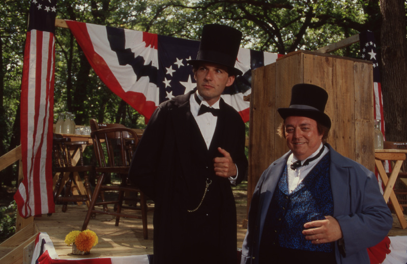 Two people, one dressed as Abraham Lincoln, the other dressed as Stephen Douglas, stand in front of the debate platform near a podium and red, white, and blue banners with stars. This photograph was taken as part of filming C-SPAN's Lincoln-Douglas Debates series in Freeport, Illinois.