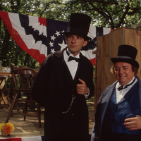 Lincoln and Douglas impersonators in front of debate platform, Freeport, Illinois