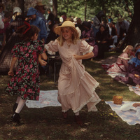 Two children in long dresses skip in a circle arm in arm, while other children in 19th-century period costumes sitting on blankets look on. A large crowd stands behind them. This photograph was taken as part of filming C-SPAN's Lincoln-Douglas Debates series in Freeport, Illinois.