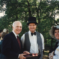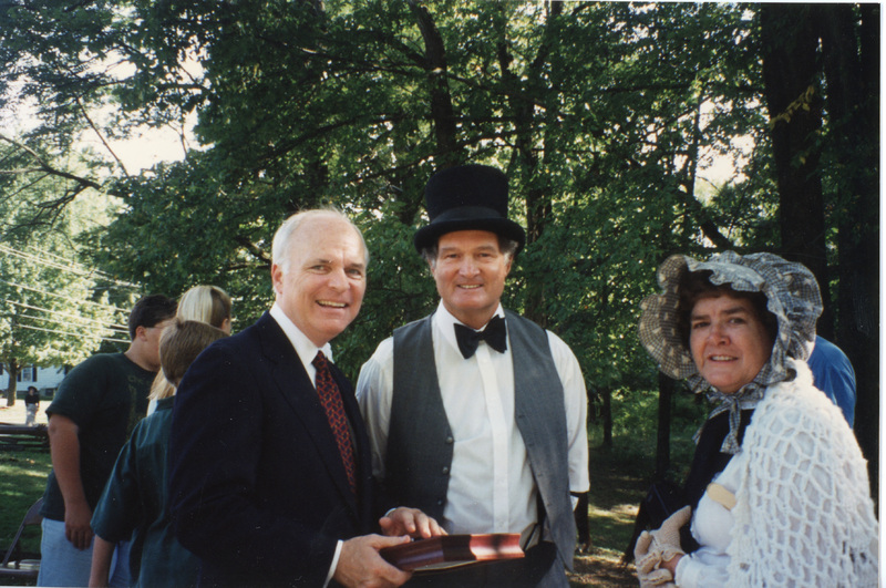 Brian Lamb poses with Tom and Lilly Myrick, who are dressed in 19th century period costume, prior to the Lincoln-Douglas debate reenactment. This photograph was taken as part of filming C-SPAN's Lincoln-Douglas Debates series in Jonesboro, Illinois.