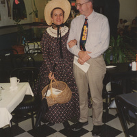 A person in a 19th-century period dress stands arm in arm with a person in a restaurant with a checked floor. This photograph was taken as part of filming C-SPAN's Lincoln-Douglas Debates series in Jonesboro, Illinois.