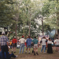 A scene of people mingling at an outdoor event with chairs facing a platform with red, white, and blue banners with stars and stripes. This photograph was taken as part of filming C-SPAN's Lincoln-Douglas Debates series in Jonesboro, Illinois.