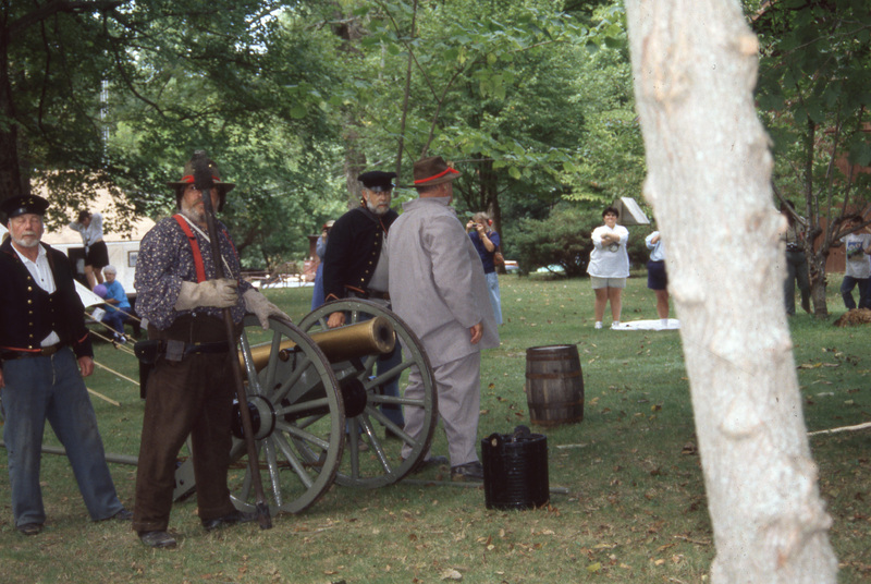 Four people dressed in 19th-century period costume stand outdoors around a Civil War-era cannon. This photograph was taken as part of filming C-SPAN's Lincoln-Douglas Debates series in Jonesboro, Illinois.