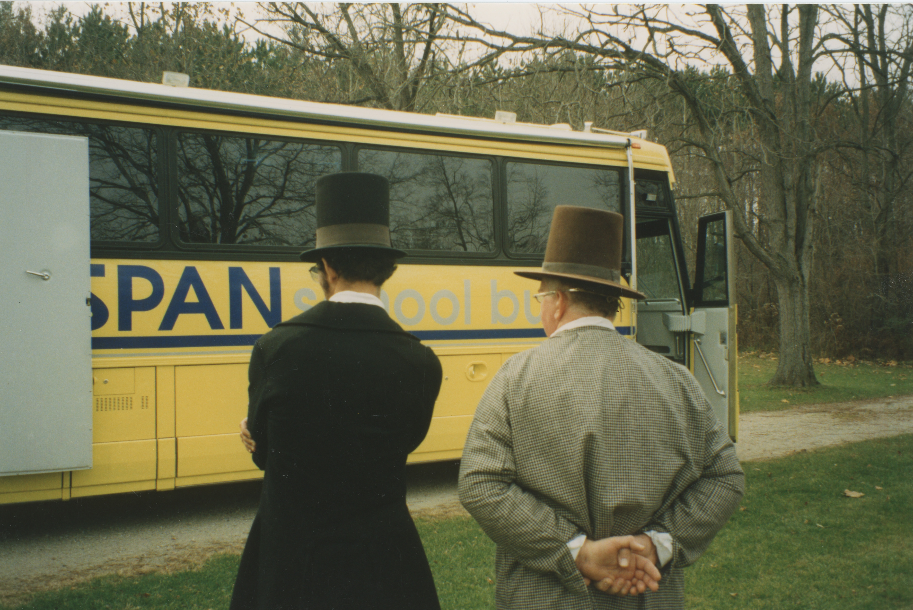 Two people in 19th-century period costume stand in front of the C-SPAN School Bus with their backs to the camera. This photograph was taken as part of filming C-SPAN's Lincoln-Douglas Debates series in Charleston, Illinois.