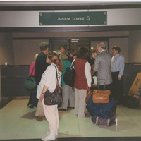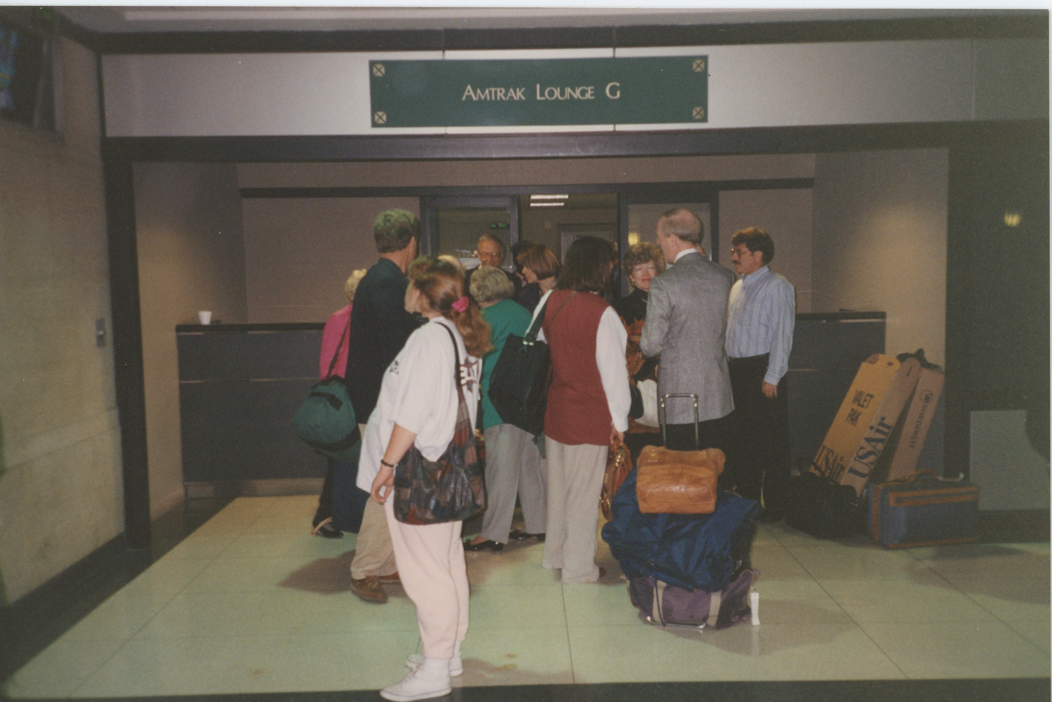 A group of people, some with luggage, stand outside the entrance to Amtrak Lounge G. This photograph was taken while the C-SPAN crew was en route from Chicago, Illinois to Galesburg, Illinois while filming the Lincoln-Douglas Debates series.