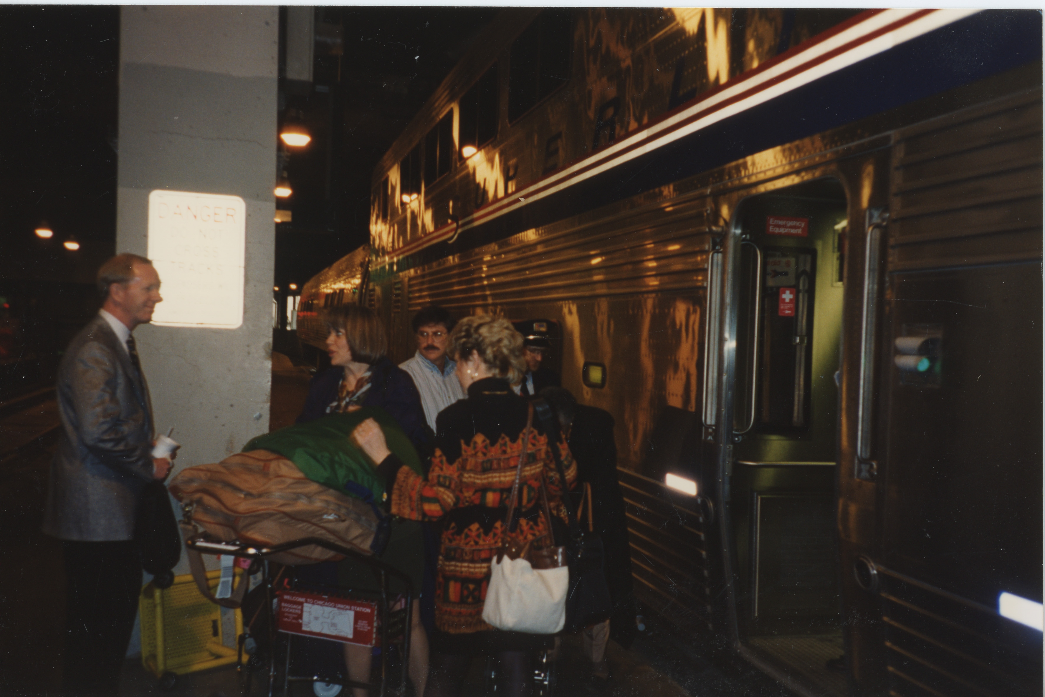 People near train with luggage card, Chicago to Galesburg, Illinois