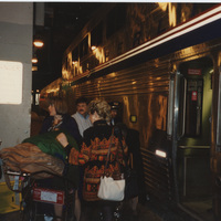 A few people stand outside a train near a filled luggage cart. This photograph was taken while the C-SPAN crew was en route from Chicago, Illinois to Galesburg, Illinois while filming the Lincoln-Douglas Debates series.