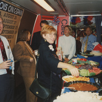 A group of people mingle near a table of refreshments. Banners and posters celebrating the Lincoln-Douglas Debates series adorn the walls. This photograph was taken while the C-SPAN crew was en route from Chicago, Illinois to Galesburg, Illinois while filming the Lincoln-Douglas Debates series.