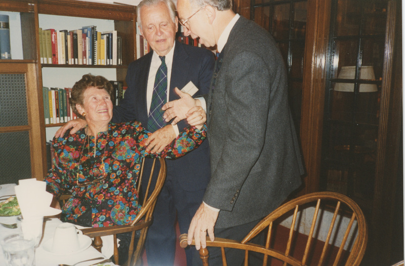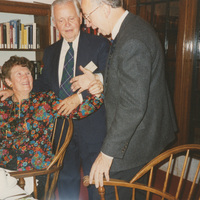 Three people, one seated, stand near a dining table and converse. This photograph was taken as part of filming C-SPAN's Lincoln-Douglas Debates series in Galesburg, Illinois.
