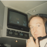 A member of the production staff, possibly identified as K. King, wears a headset and watches a television playing the Lincoln-Douglas debate re-enactment. This photograph was taken as part of filming C-SPAN's Lincoln-Douglas Debates series in Galesburg, Illinois.