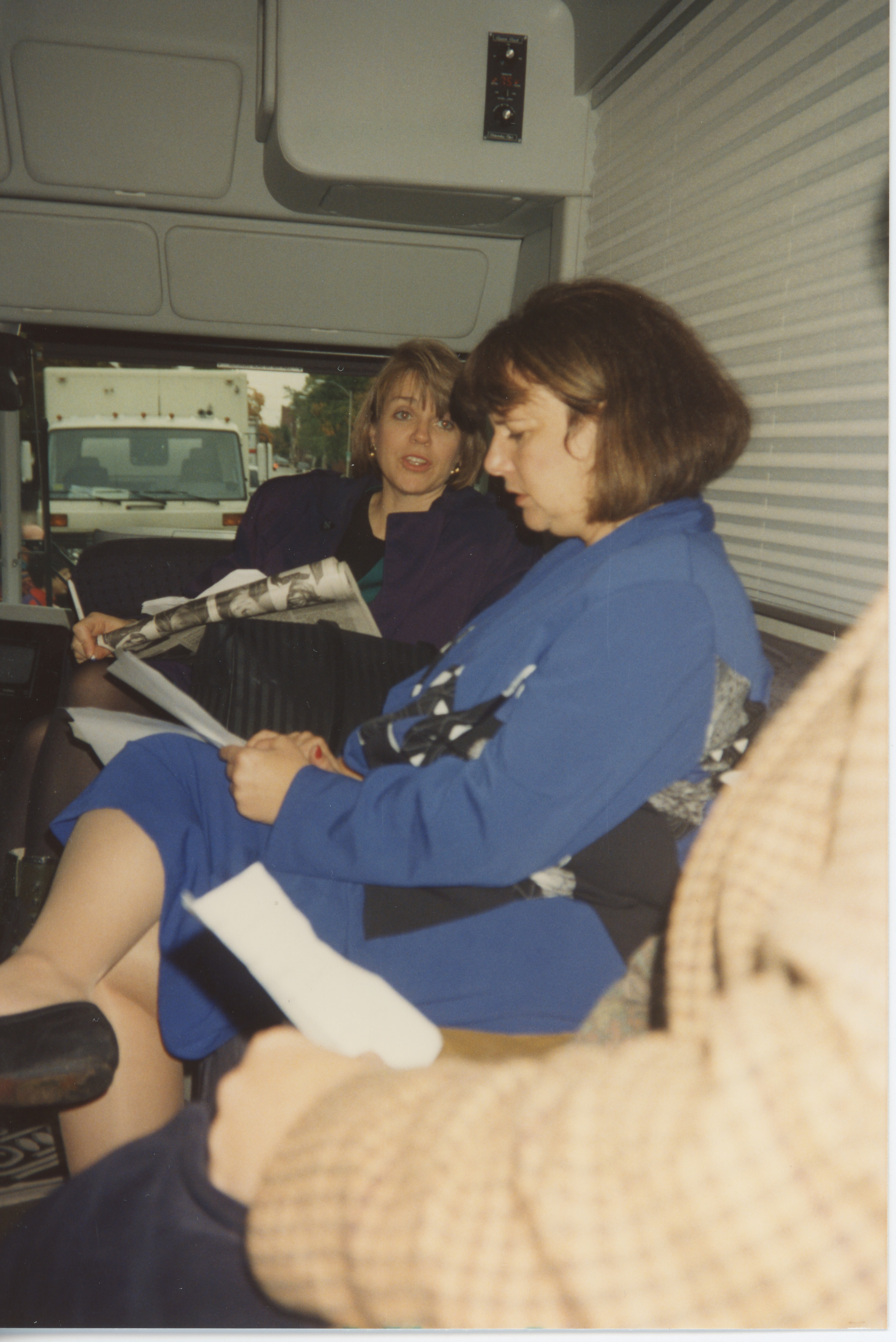 Susan Swain speaks with a person while both are seated on couches in a small production area. This photograph was taken as part of filming C-SPAN's Lincoln-Douglas Debates series in Galesburg, Illinois.