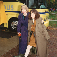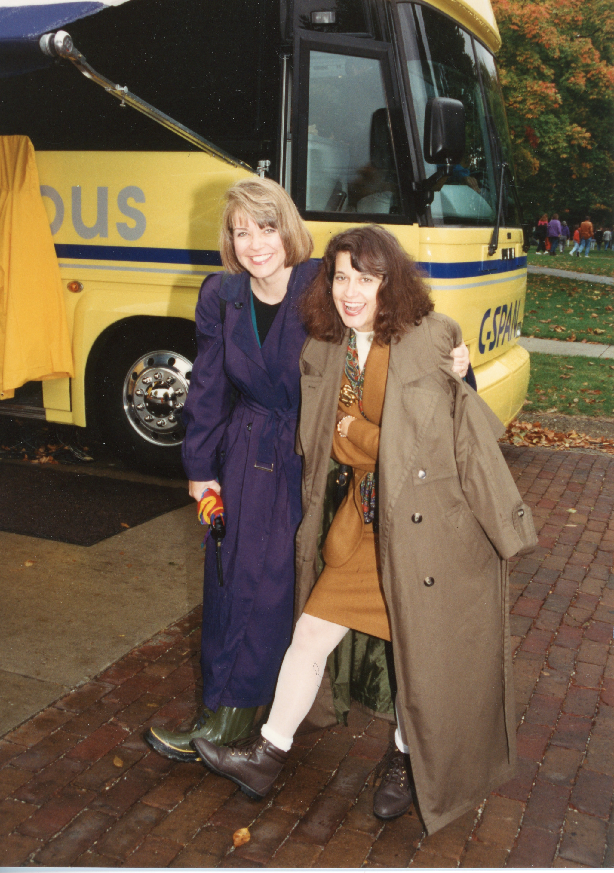 Susan Swain and another person wrapped in a coat stand near the C-SPAN Bus. This photograph was taken as part of filming C-SPAN's Lincoln-Douglas Debates series in Galesburg, Illinois.