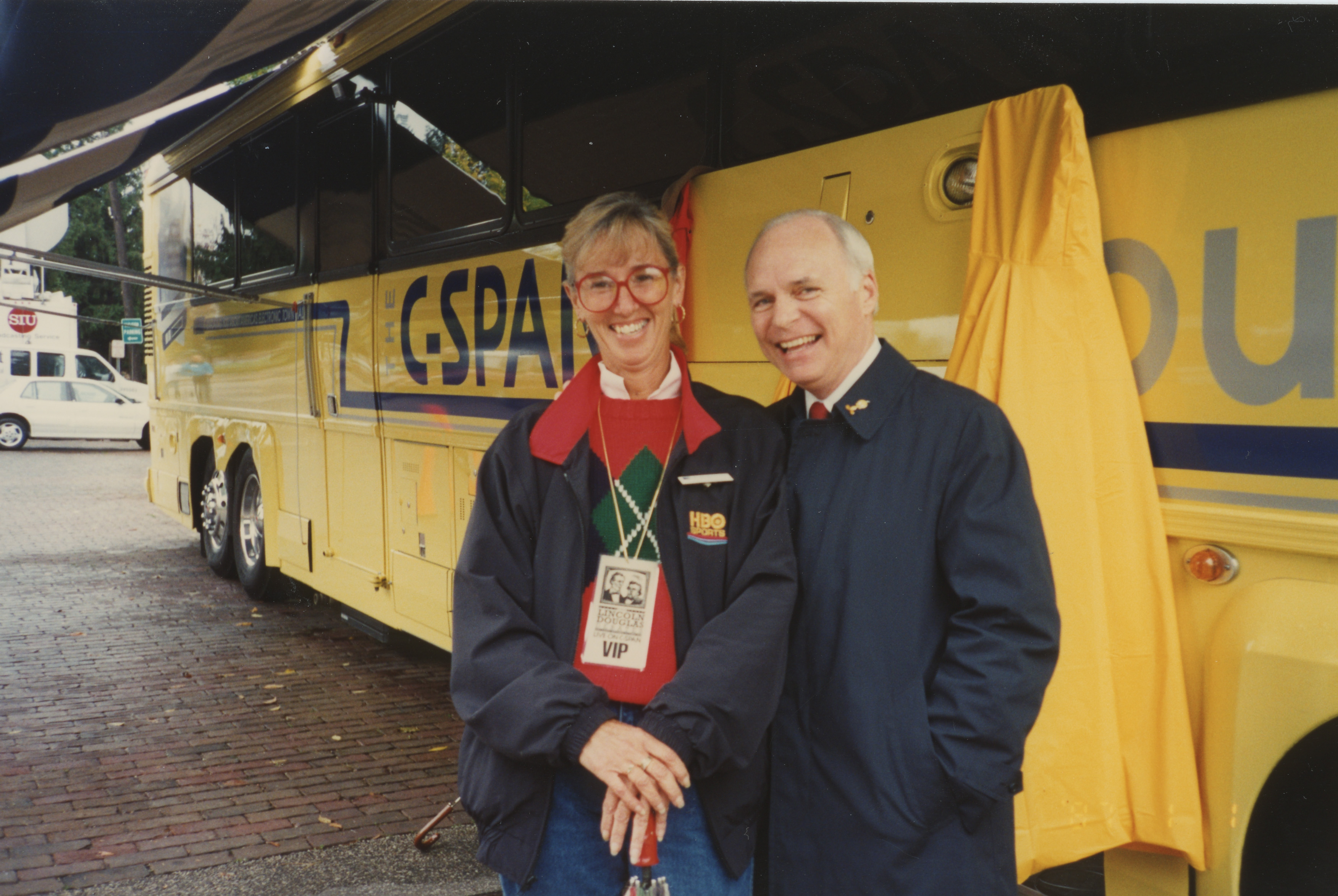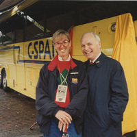 Brian Lamb stands near the C-SPAN Bus with another person wearing a Lincoln-Douglas Debate VIP badge. This photograph was taken as part of filming C-SPAN's Lincoln-Douglas Debates series in Galesburg, Illinois.
