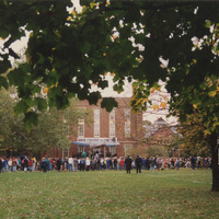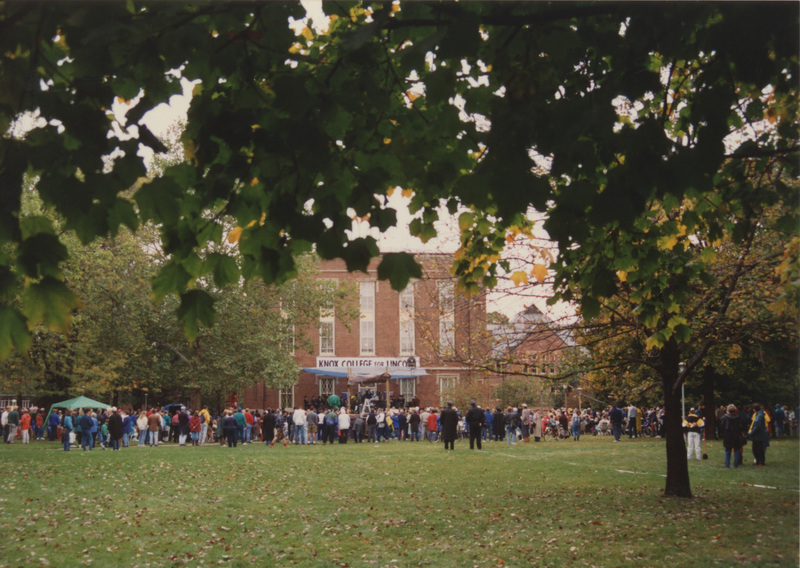 A view across the campus to large group of people standing outside a brick building bearing a banner which reads "Knox College for Lincoln." This photograph was taken as part of filming C-SPAN's Lincoln-Douglas Debates series in Galesburg, Illinois.