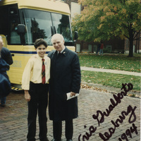 Brian Lamb stands with a young child outside the C-SPAN Bus. The text on the photo is unclear but may read "Cris Gualberto, Galesburg, Oct 8, 1994." This photograph was taken as part of filming C-SPAN's Lincoln-Douglas Debates series in Galesburg, Illinois.