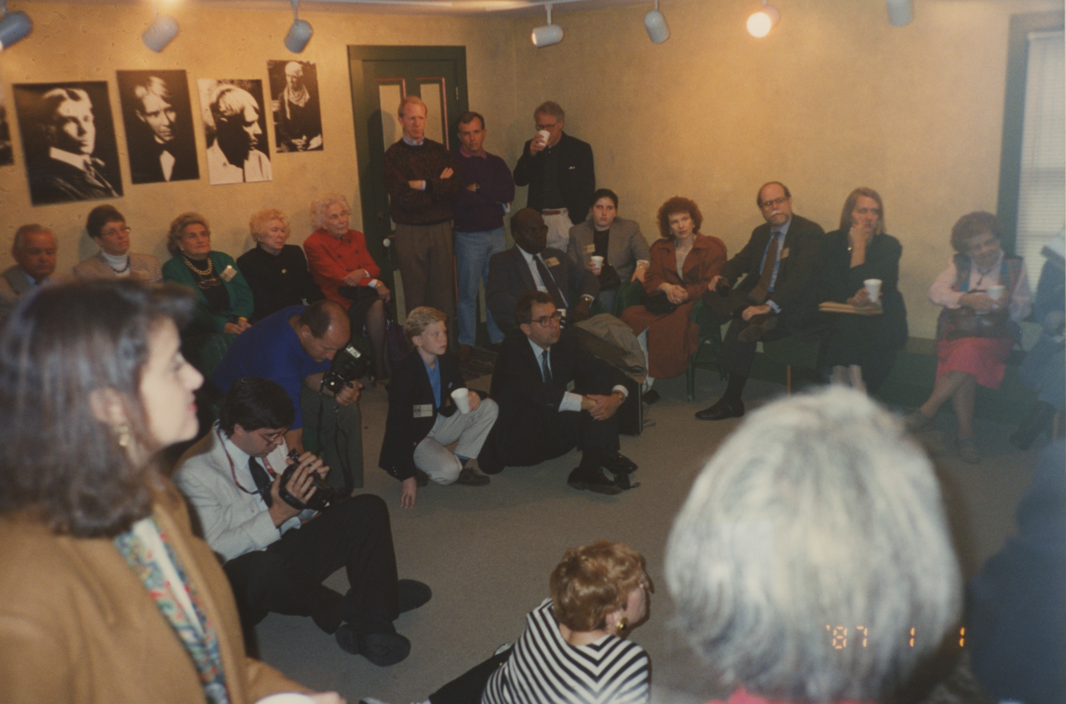 A group of people stand in a circle, some sitting on the floor, others seated on chairs, and others standing. This photograph was taken as part of filming C-SPAN's Lincoln-Douglas Debates series in Galesburg, Illinois.