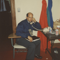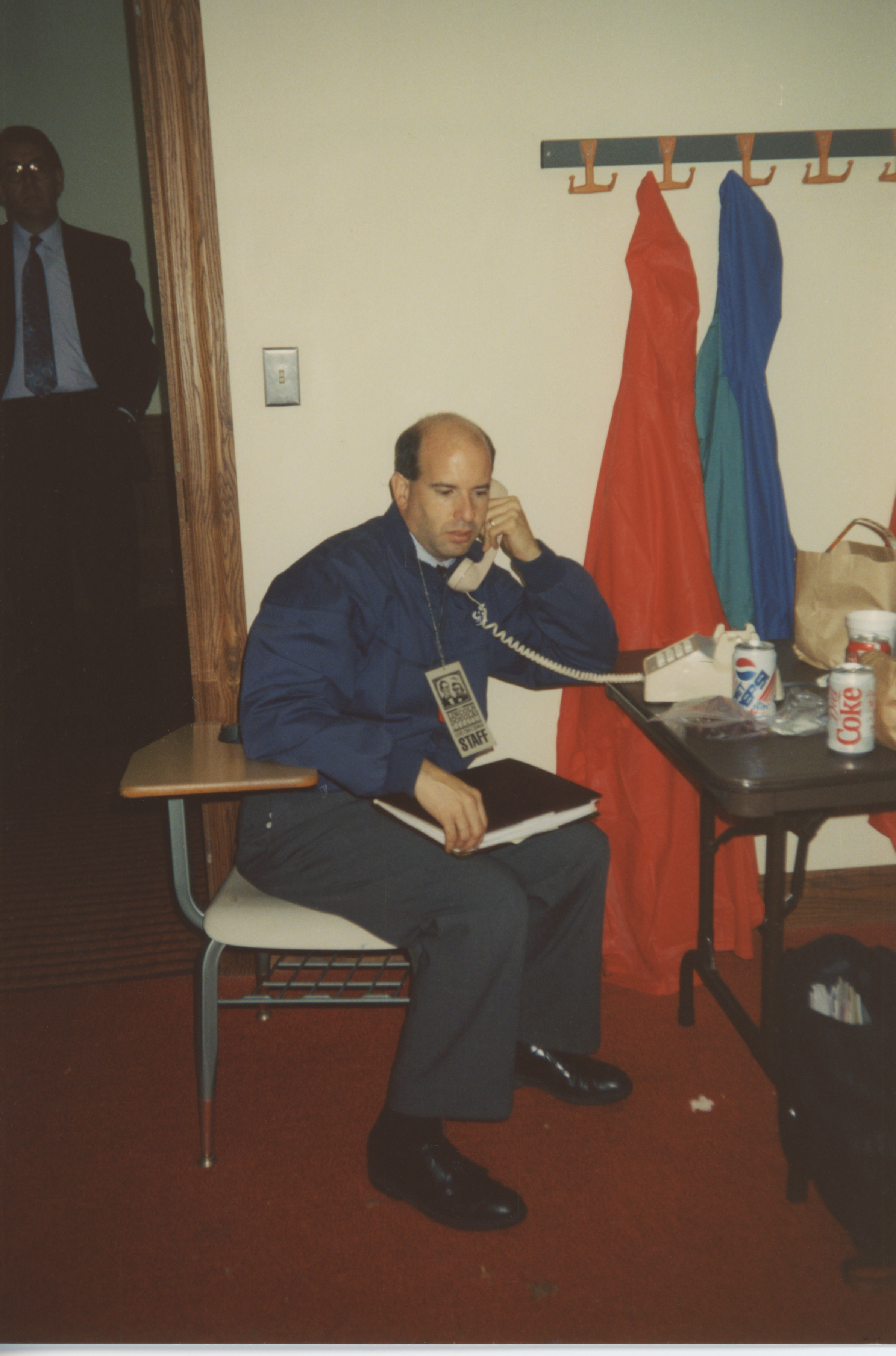 A member of the Lincoln-Douglas Debates staff seated at a school desk talks on the telephone. This photograph was taken as part of filming C-SPAN's Lincoln-Douglas Debates series in Galesburg, Illinois.