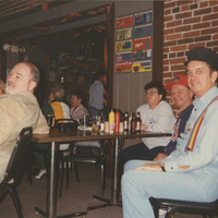 Several people sit at dining tables in a room decorated with streamers. This photograph was taken as part of filming C-SPAN's Lincoln-Douglas Debates series in Galesburg, Illinois.