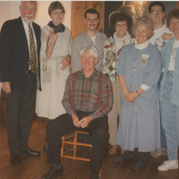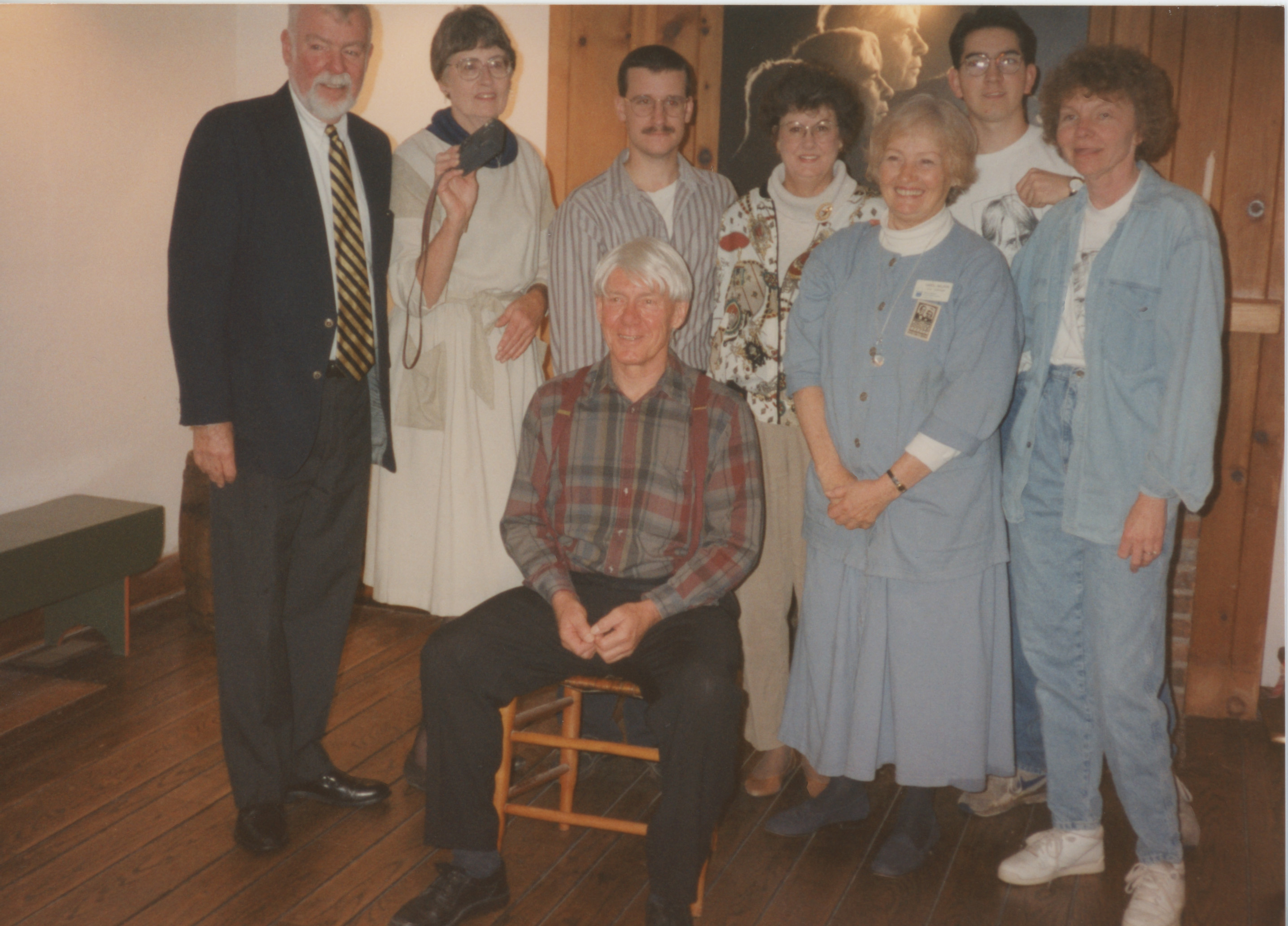 A group of people, including Carol Nelson, Site Manager of the Carl Sandburg State Historic Site (third from left) and Carl Sandburg impersonator Nick Earl (seated) pose for a picture. This photograph was taken as part of filming C-SPAN's Lincoln-Douglas Debates series in Galesburg, Illinois.