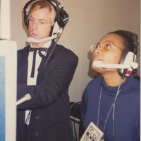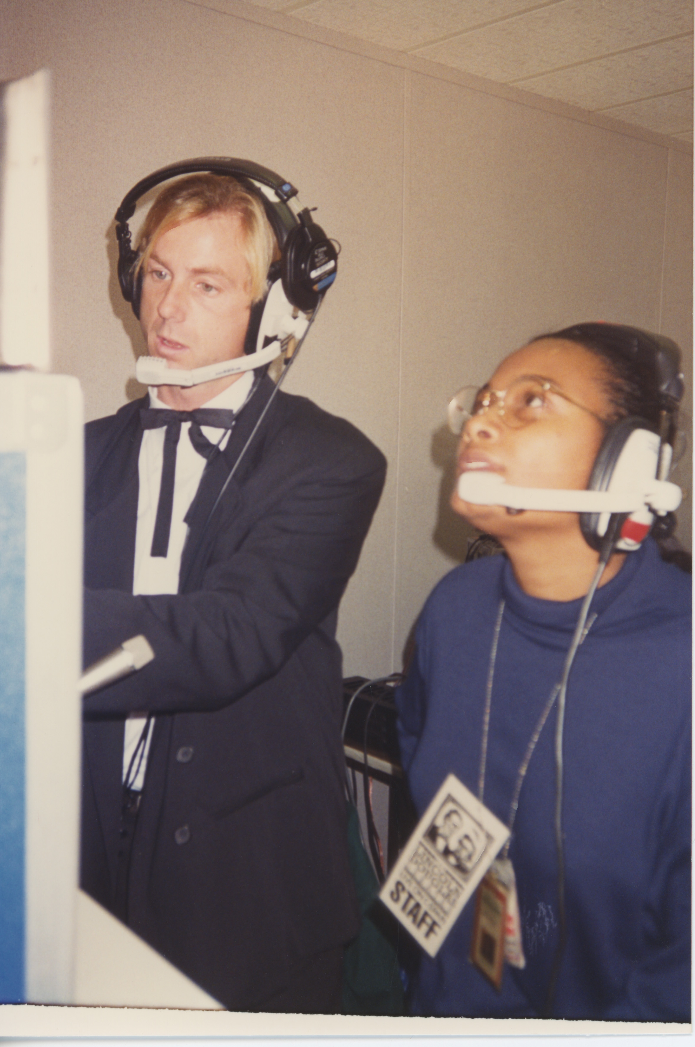 Sherry Sanders-Smith and another person, both wearing headsets, appear to watch a screen which is out of frame. This photograph was taken as part of filming C-SPAN's Lincoln-Douglas Debates series in Quincy, Illinois.