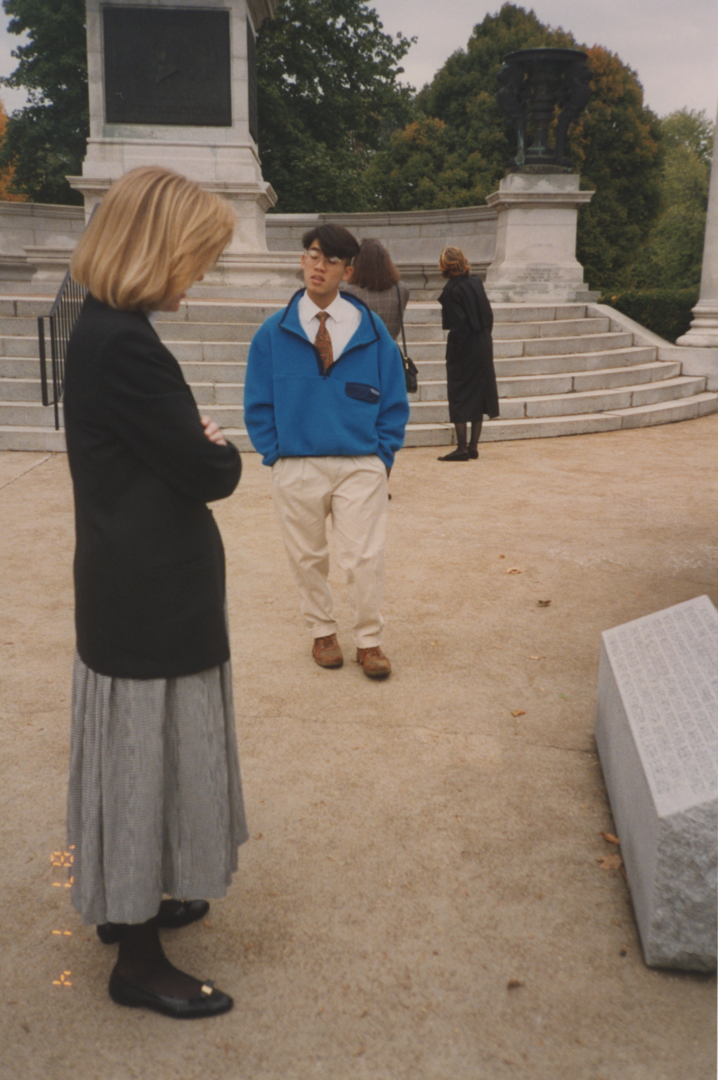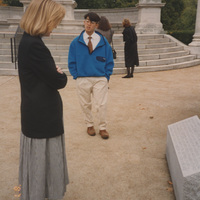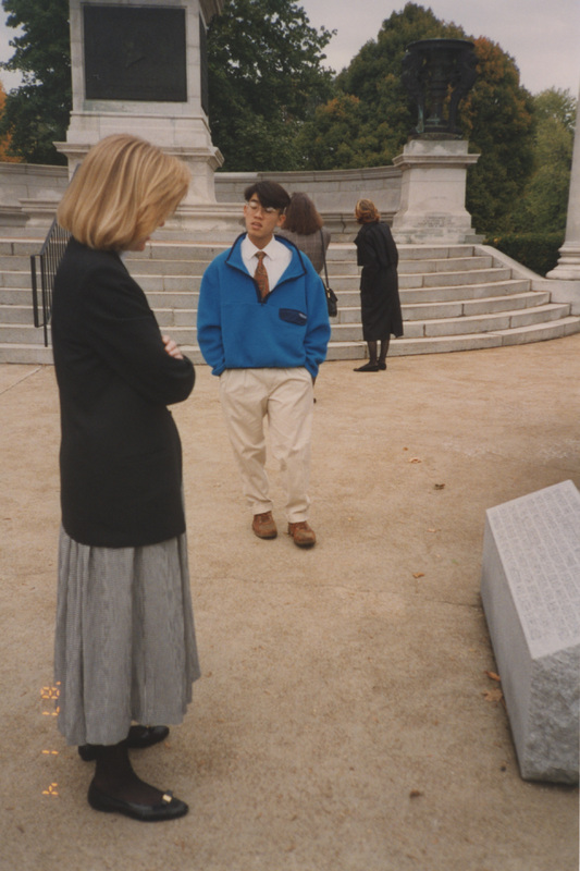 Two people stand near a young person in a large courtyard. This photograph was taken as part of filming C-SPAN's Lincoln-Douglas Debates series in Alton, Illinois.