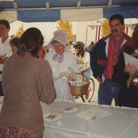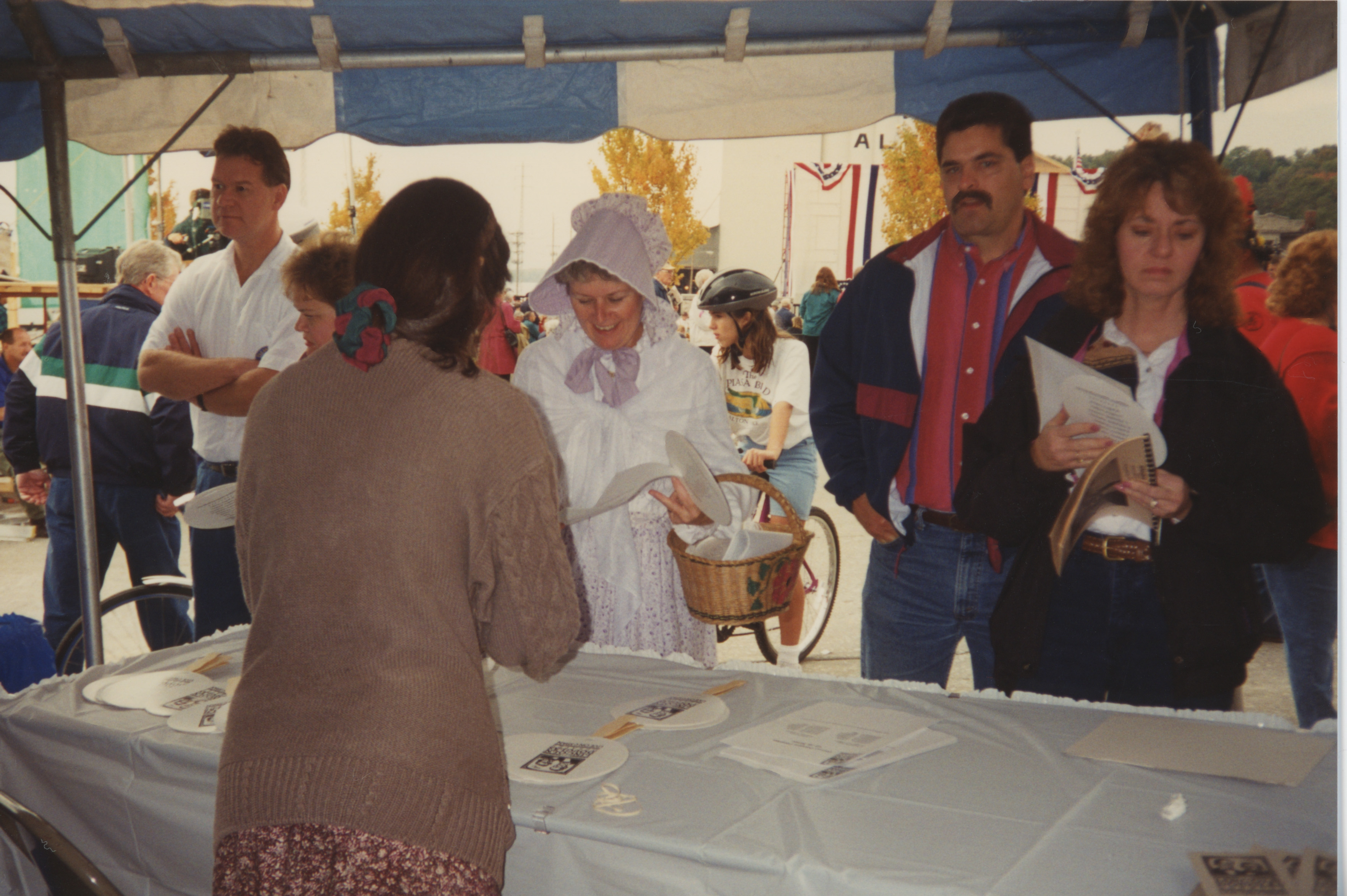 Individuals, some dressed in 19th-century period costume, pick up programs at a table underneath an outdoor tent. This photograph was taken as part of filming C-SPAN's Lincoln-Douglas Debates series in Galesburg, Illinois.