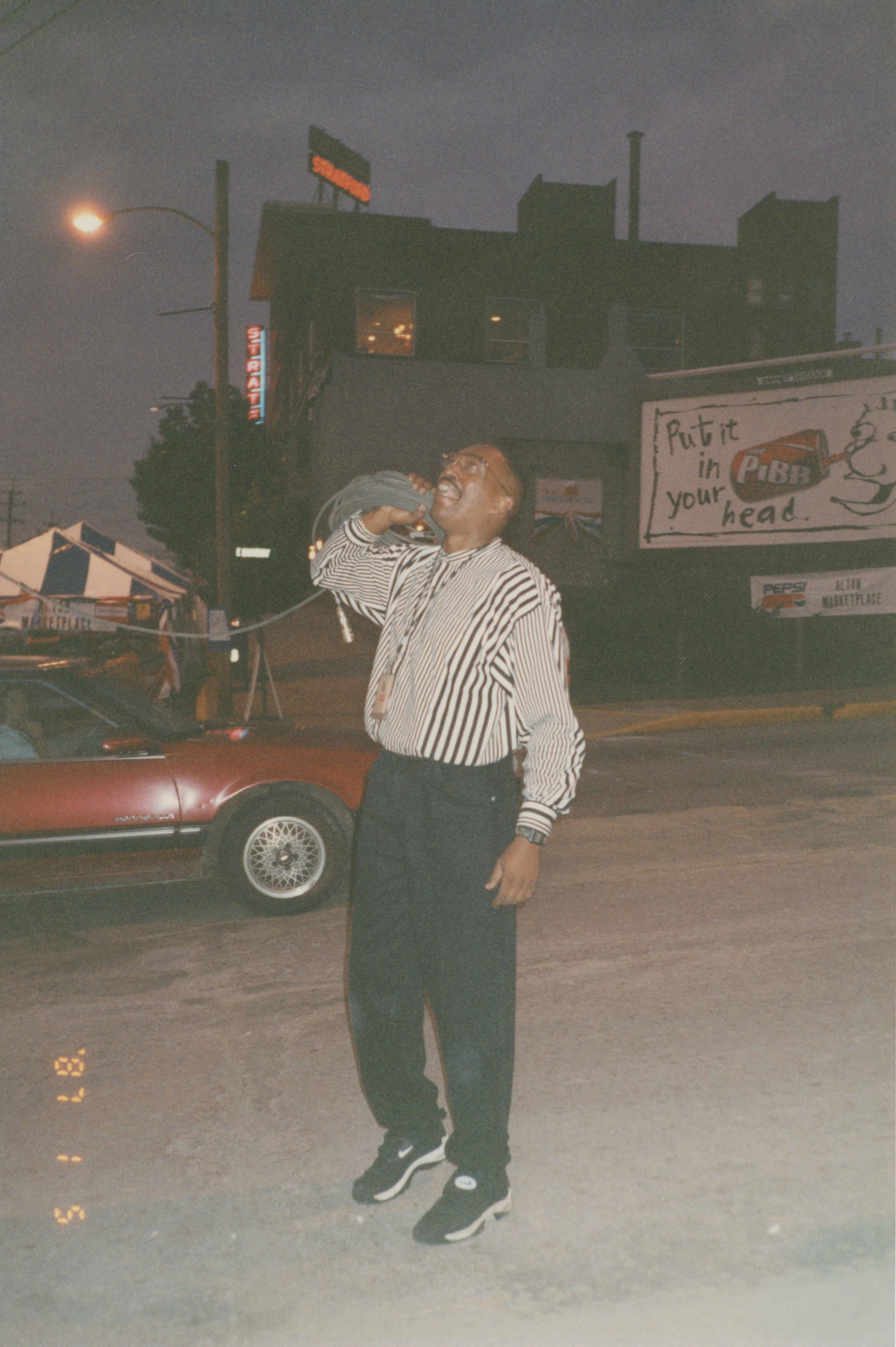 A person holding a large, coiled electrical cord stands in a dark street and looks up at the sky. This photograph was taken as part of filming C-SPAN's Lincoln-Douglas Debates series in Galesburg, Illinois.