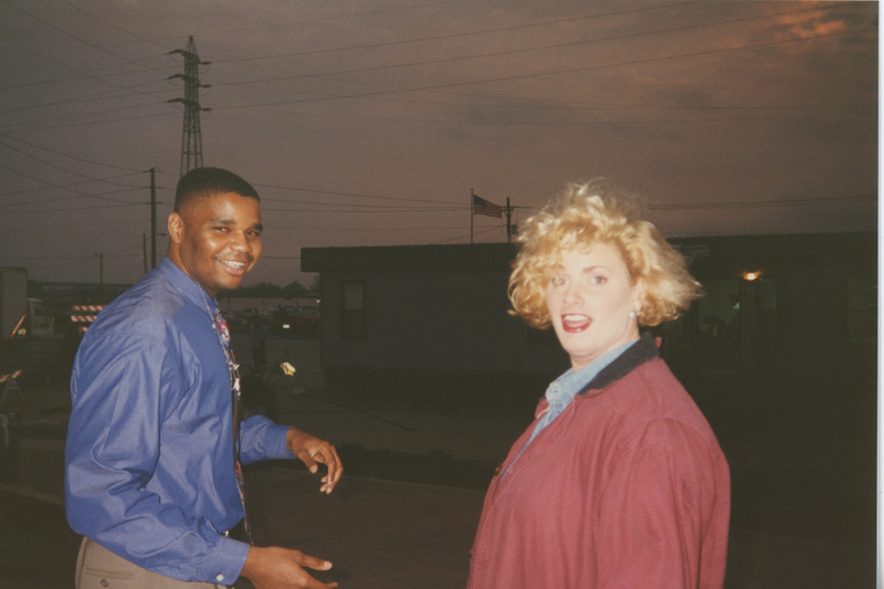 Two people stand outdoors in the evening and smile at the camera. This photograph was taken as part of filming C-SPAN's Lincoln-Douglas Debates series in Alton, Illinois.