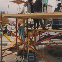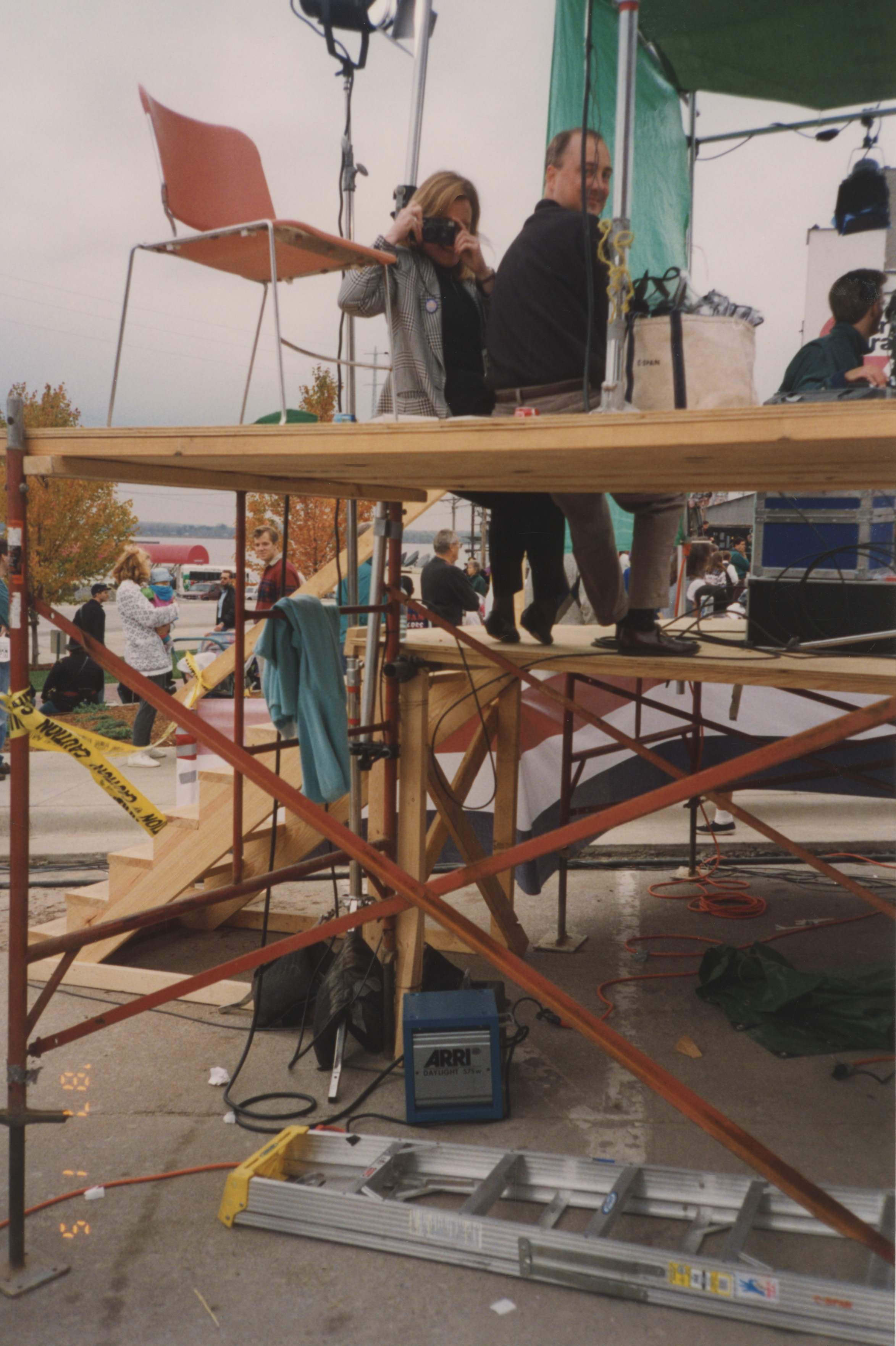 Individuals sit on a tall outdoor platform with production lights; one person takes a picture of the photographer. This photograph was taken as part of filming C-SPAN's Lincoln-Douglas Debates series in Alton, Illinois.