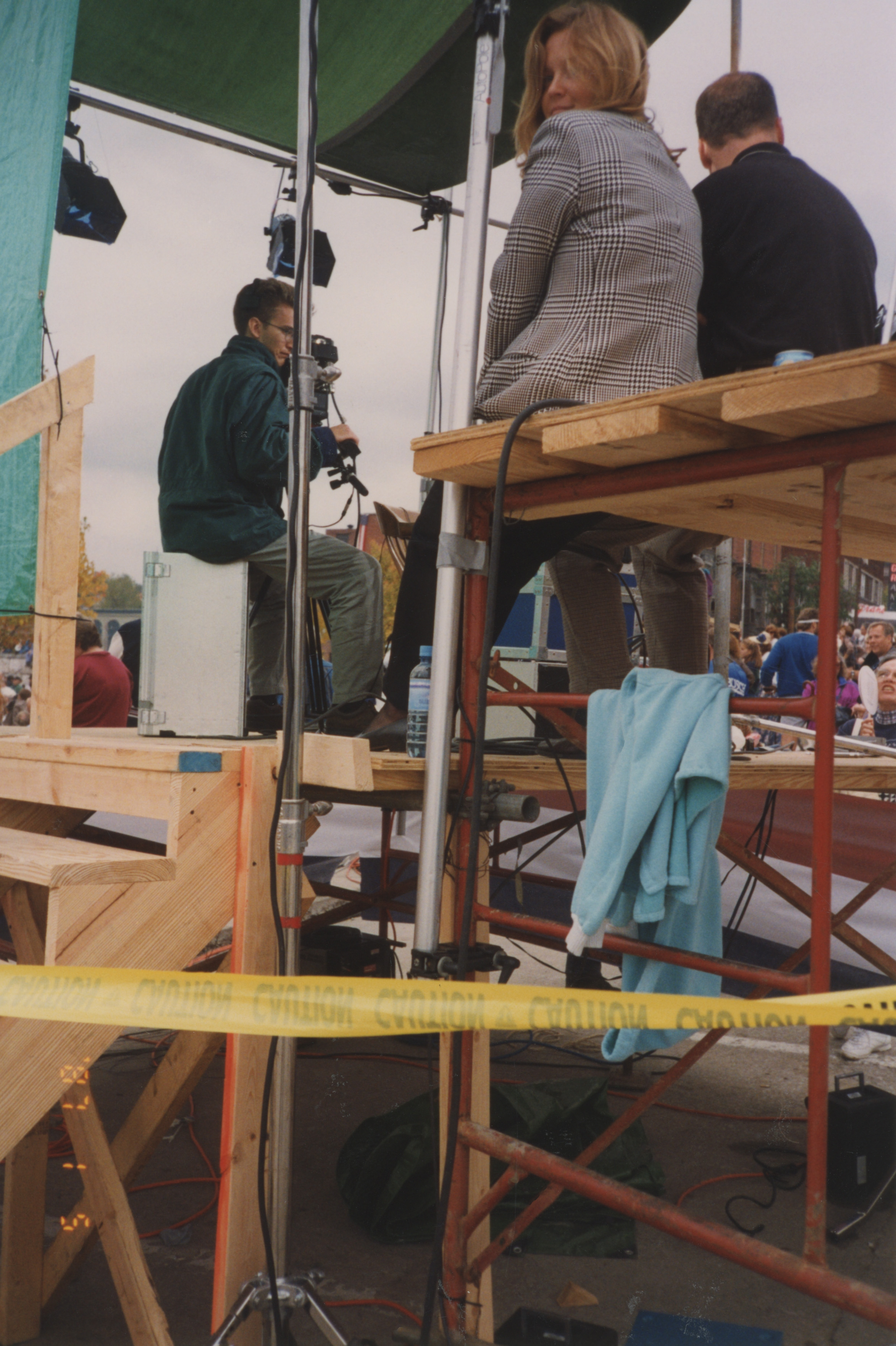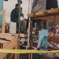 Individuals sit on a tall outdoor platform with production lights and equipment. This photograph was taken as part of filming C-SPAN's Lincoln-Douglas Debates series in Alton, Illinois.