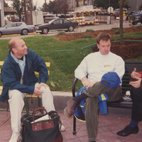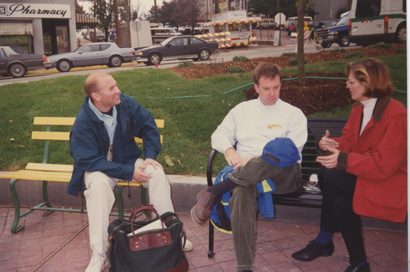 Three people seated on outdoor benches have a conversation. This photograph was taken as part of filming C-SPAN's Lincoln-Douglas Debates series in Alton, Illinois.