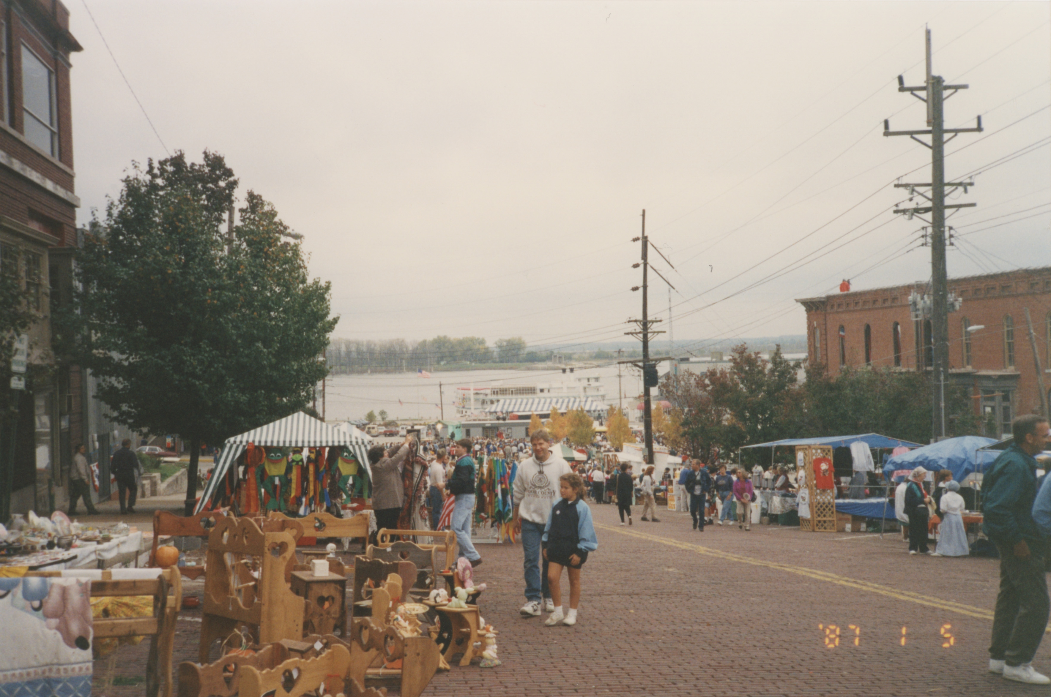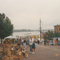 The view of a large outdoor street market with many people walking around. This photograph was taken as part of filming C-SPAN's Lincoln-Douglas Debates series in Alton, Illinois.