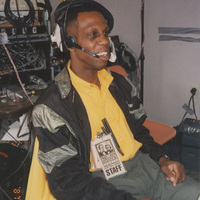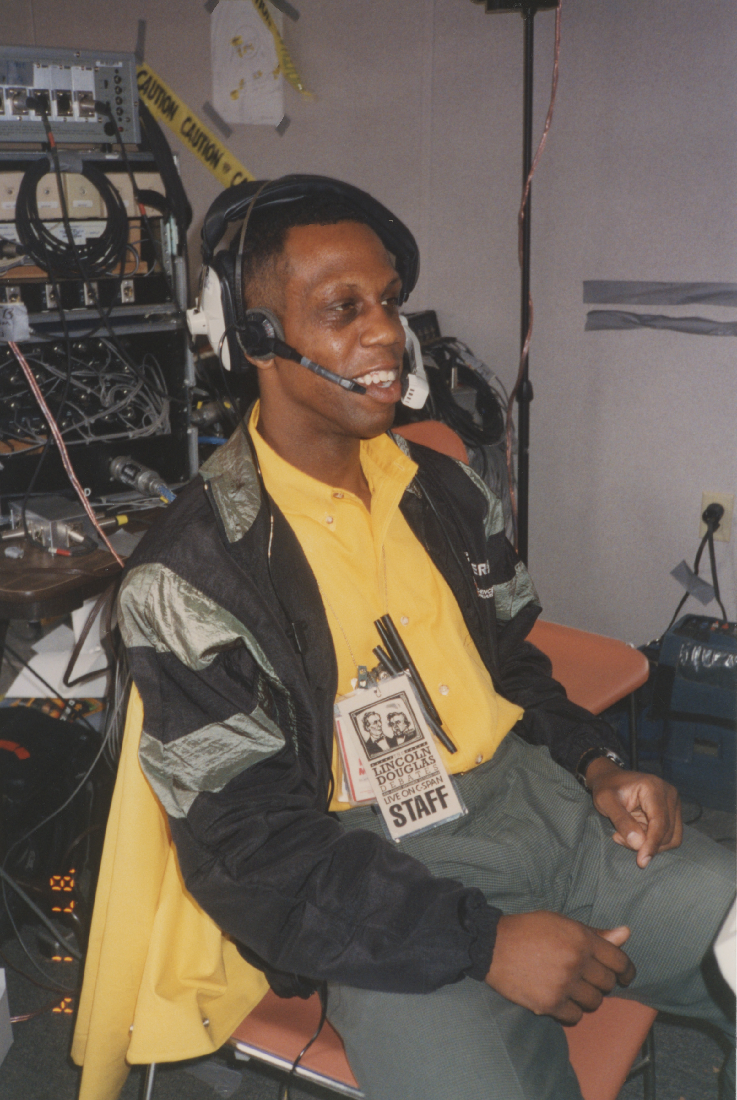 A person wearing a Lincoln-Douglas Debate Staff badge and a headset sits in a room with a lot of production equipment. This photograph was taken as part of filming C-SPAN's Lincoln-Douglas Debates series in Alton, Illinois.