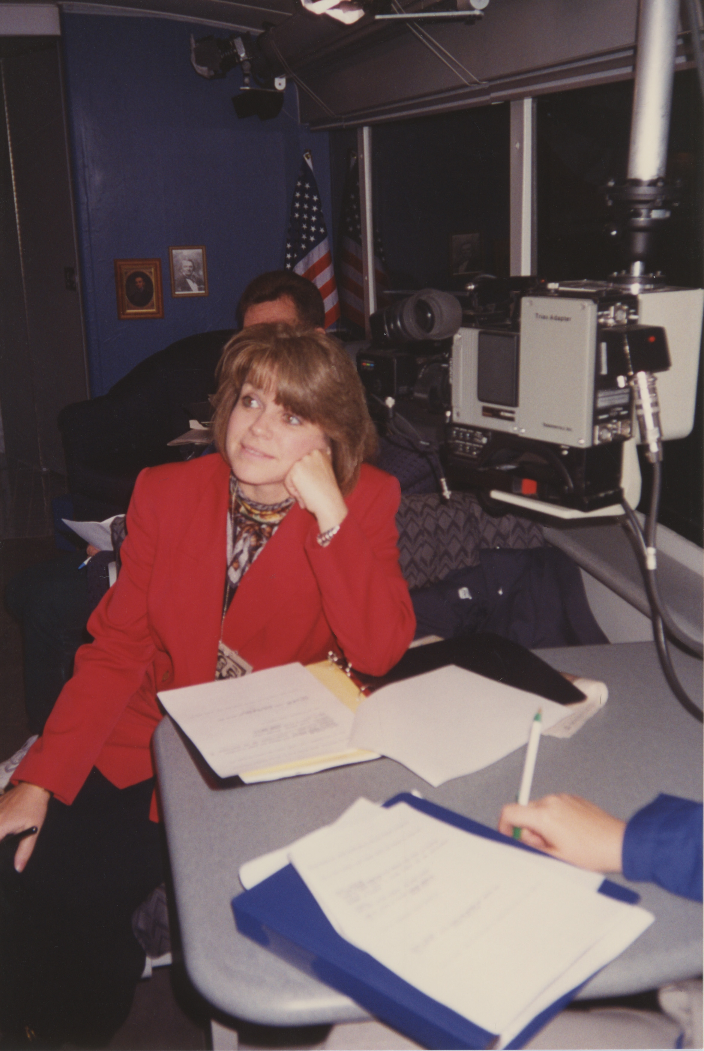 Susan Swain sits at a table near some production equipment and some papers. This photograph was taken as part of filming C-SPAN's Lincoln-Douglas Debates series in Alton, Illinois.