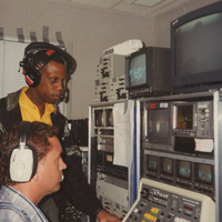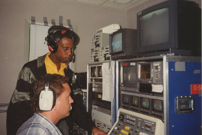 Two people wearing headsets work with production equipment. This photograph was taken as part of filming C-SPAN's Lincoln-Douglas Debates series in Alton, Illinois.