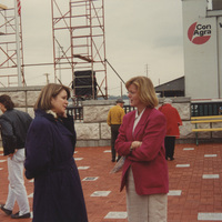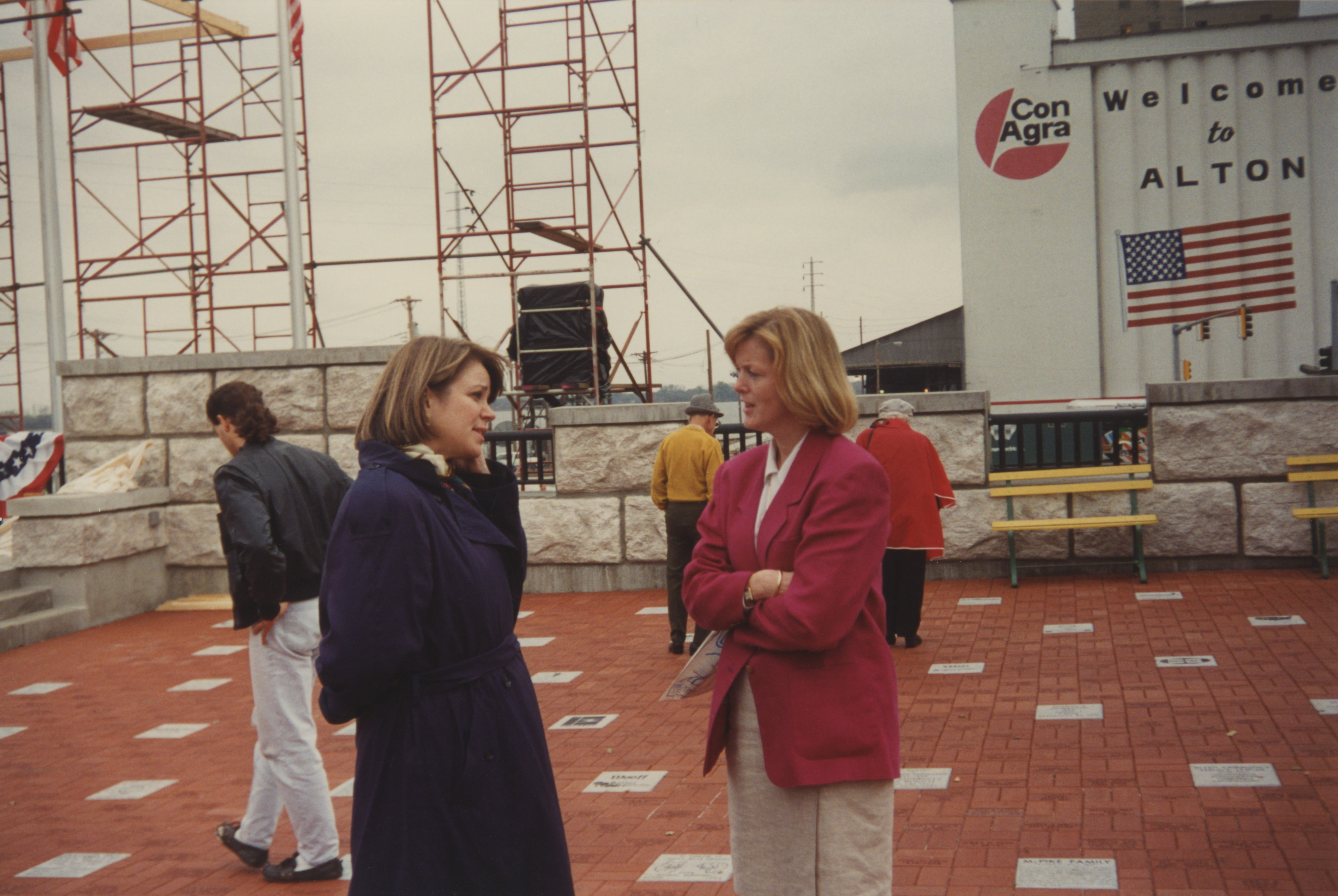 Two people have a conversation in a large, brick courtyard with large scaffolding towers while others walk around behind them. This photograph was taken as part of filming C-SPAN's Lincoln-Douglas Debates series in Alton, Illinois.