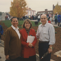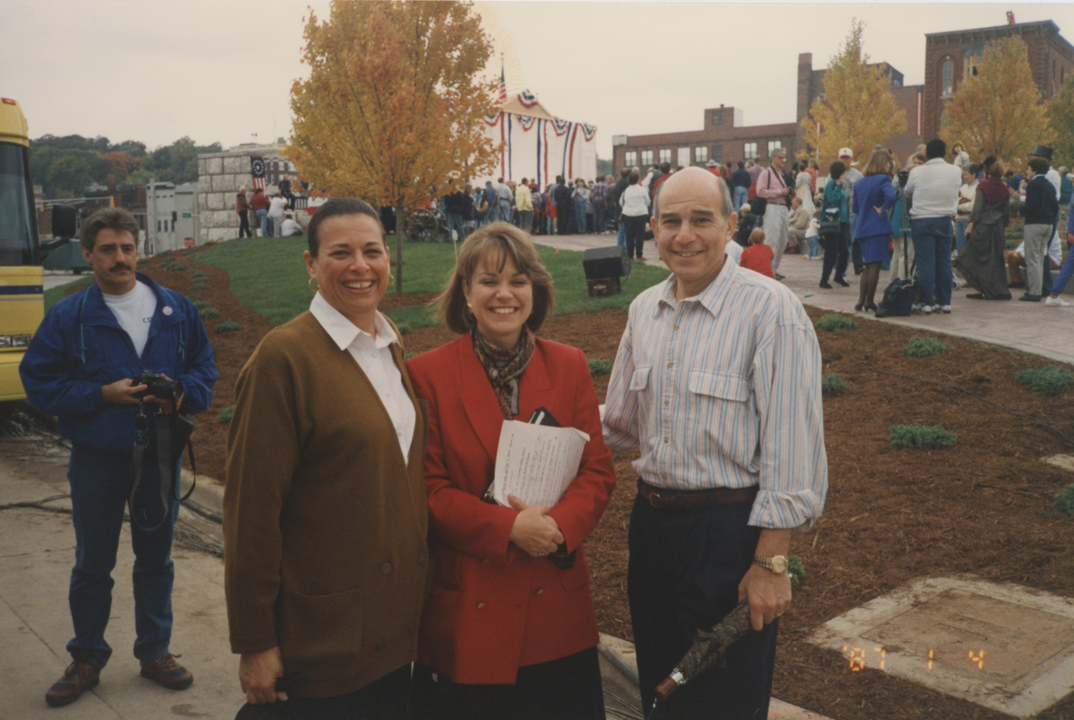Susan Swain poses with two people in an outdoor courtyard, while a person holding a camera stands behind them. This photograph was taken as part of filming C-SPAN's Lincoln-Douglas Debates series in Alton, Illinois.