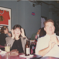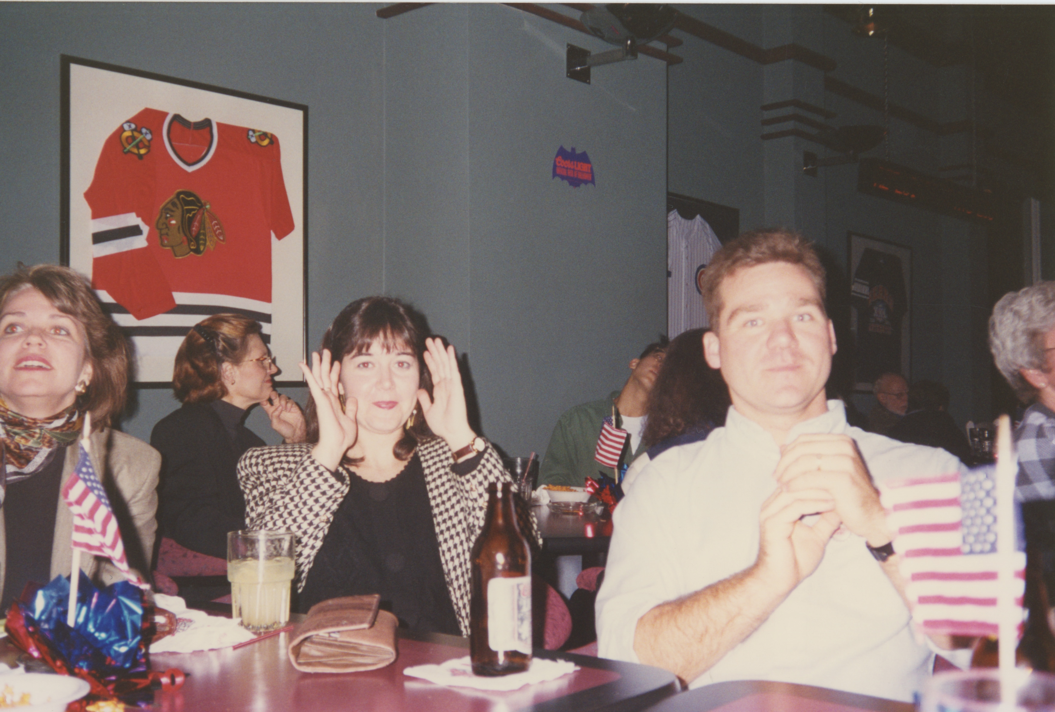 Susan Swain and two others sit at a restaurant table with beverages and small American flag decorations. A sports jersey is framed on the wall. This photograph was taken as part of filming C-SPAN's Lincoln-Douglas Debates series in Alton, Illinois.