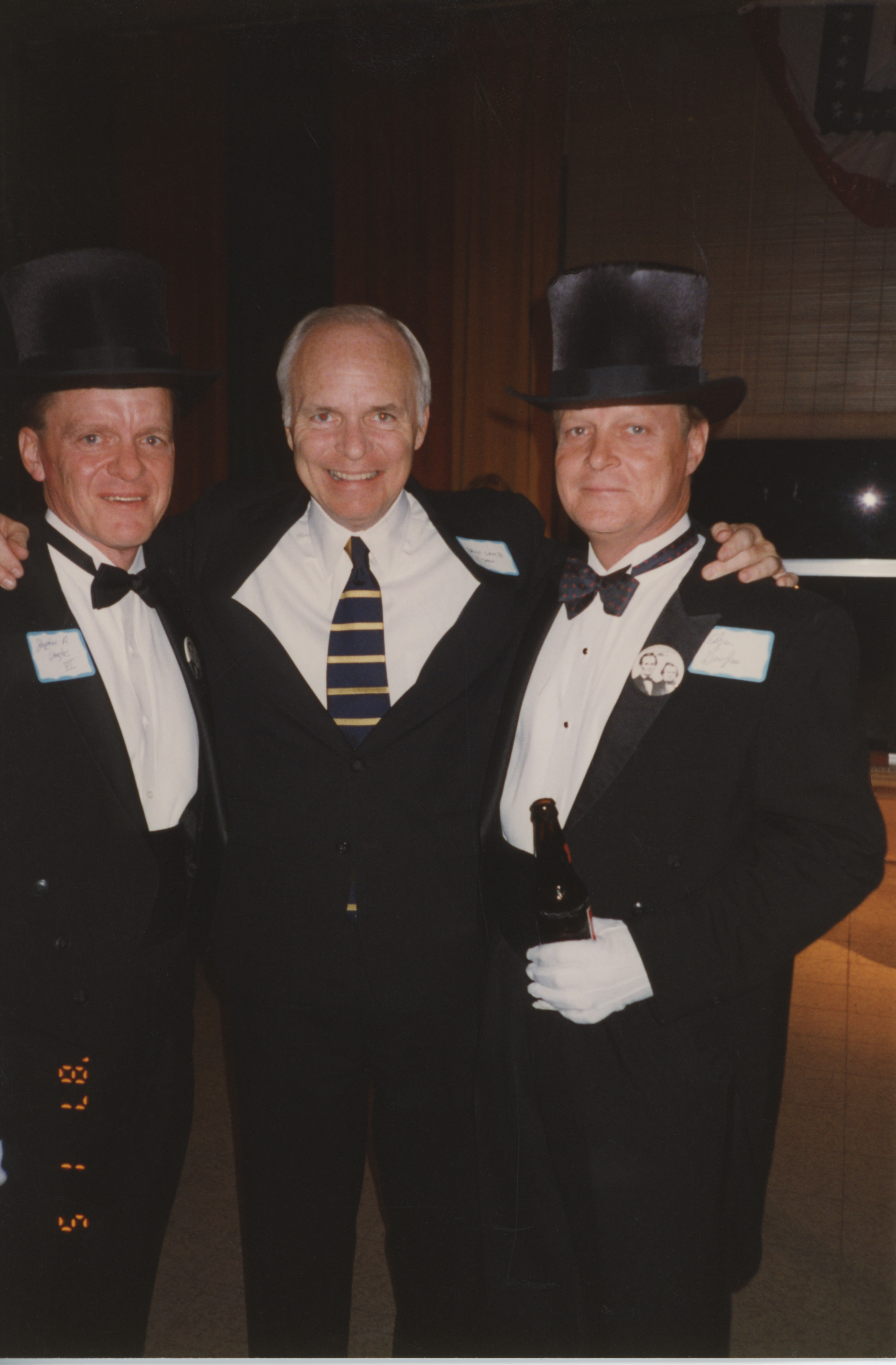Brian Lamb poses with his arms around two people dressed in 19th-century period costume. This photograph was taken as part of filming C-SPAN's Lincoln-Douglas Debates series in Alton, Illinois.