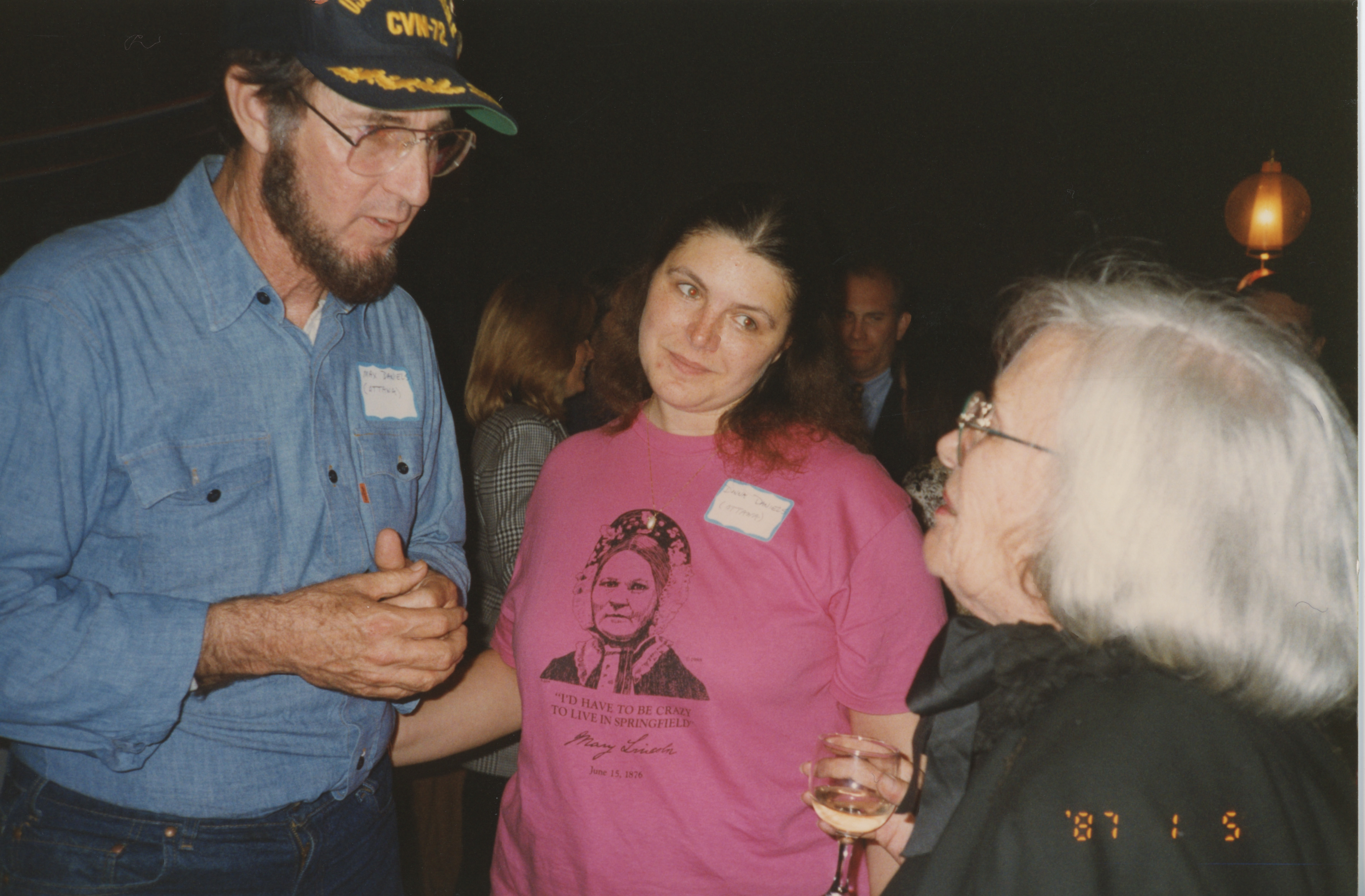 Three people, one wearing a Mary Lincoln t-shirt and one holding a wine glass, speak with an elderly person. This photograph was taken as part of filming C-SPAN's Lincoln-Douglas Debates series in Alton, Illinois.