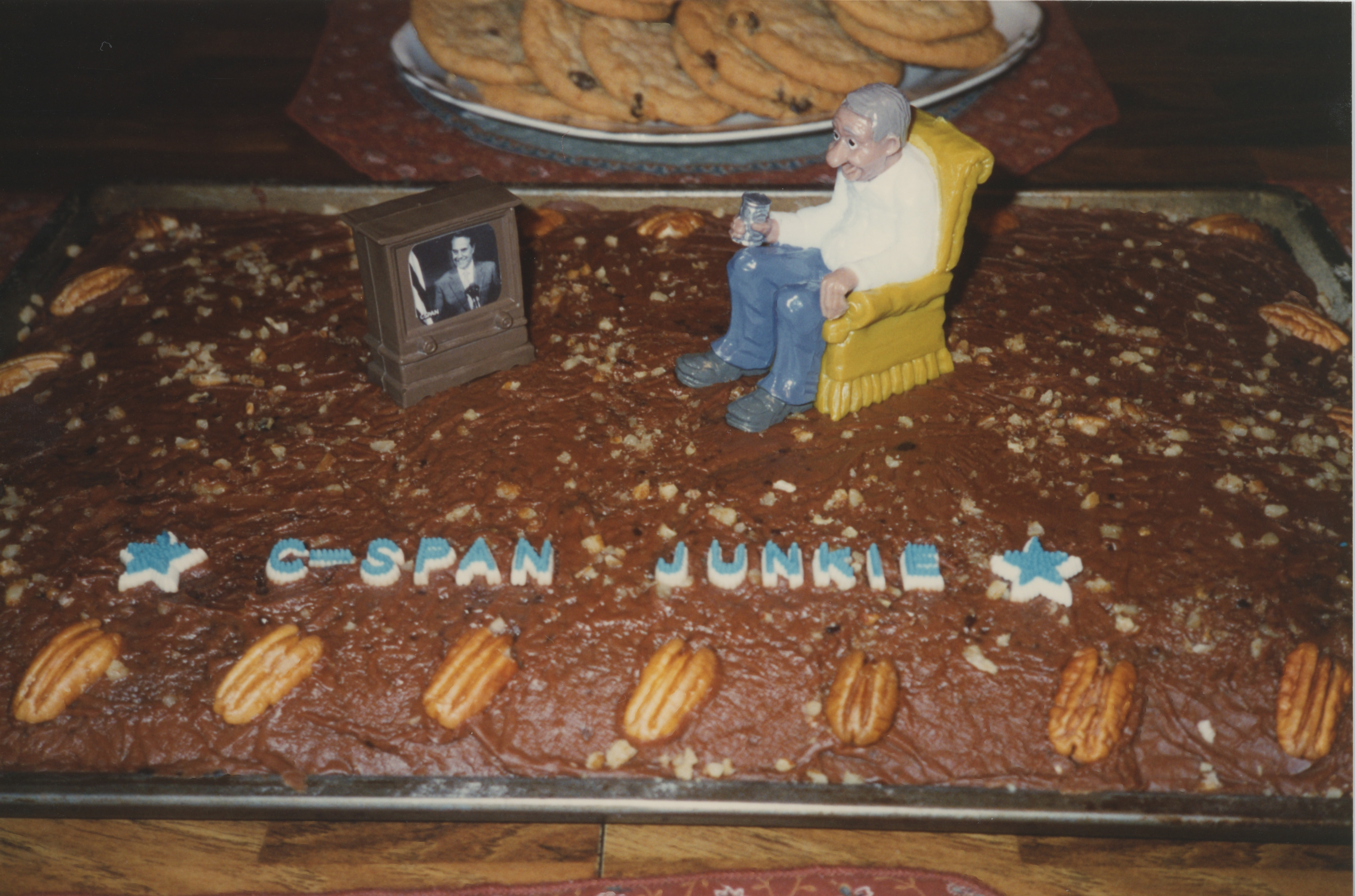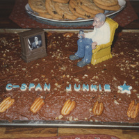 A cake decorated with a model of a person seated in a chair watching a television and the words "C-SPAN Junkie." This photograph was taken as part of filming C-SPAN's Lincoln-Douglas Debates series in Alton, Illinois.
