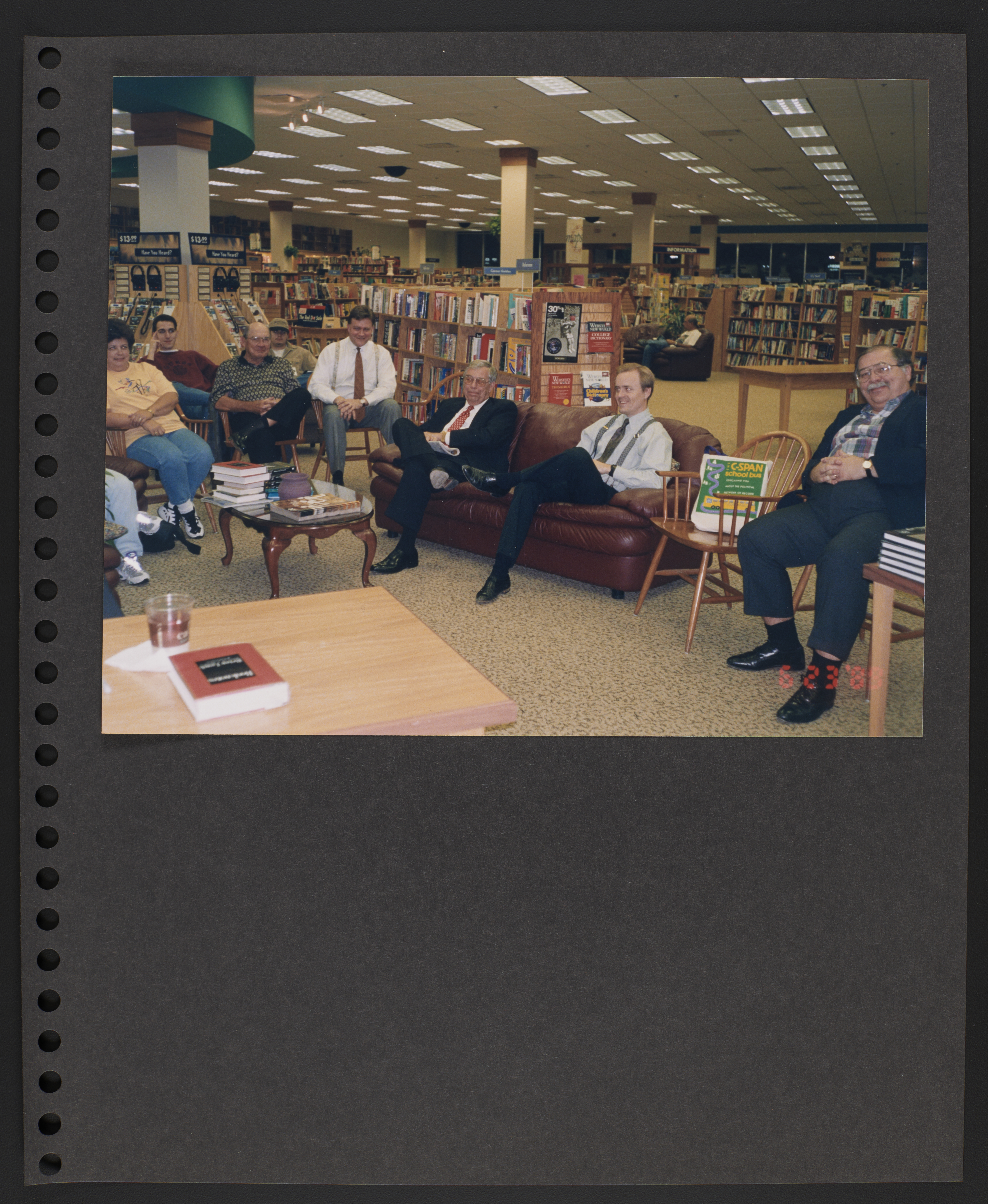 A scrapbook page with a photograph of several people seated on couches and chairs in what appears to be a bookstore.