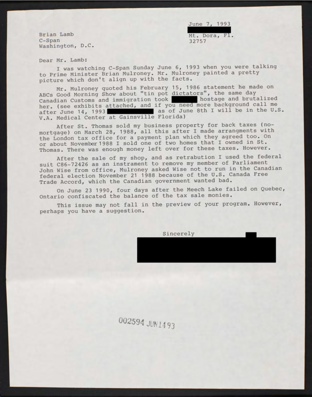 Discusses several personal topics of Canadian politics and law, including: shadiness of Brian Mulroney (Prime Minister); Canadian police; seizure of his property by them; tax law; Quebec's independence, etc.