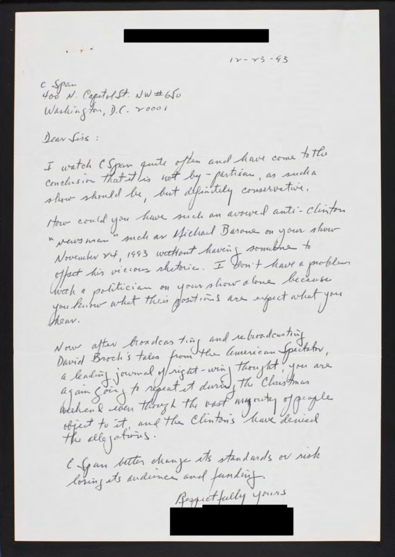 Expresses discontent with C-SPAN's conservative bias, apparent with guests such as Michael Barone and David Brock.
