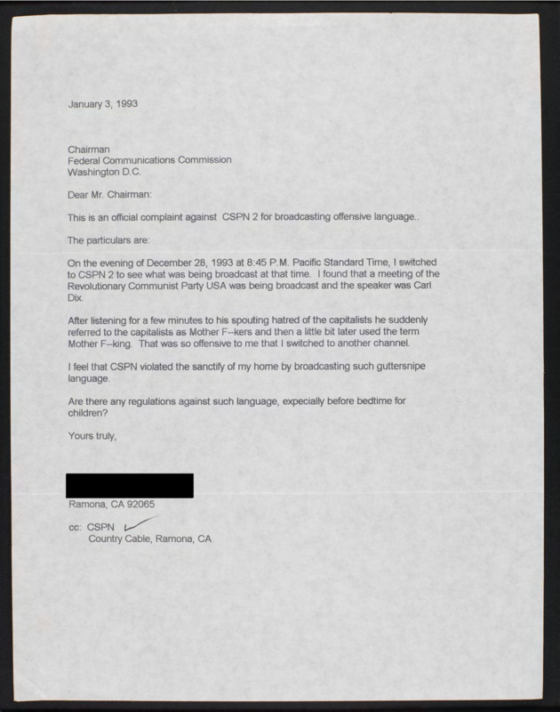 Letter to C-SPAN, 1993-01-03; 92065