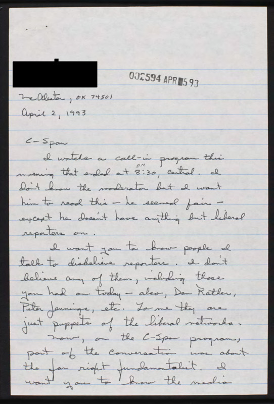 Letter to C-SPAN, 1993-04-02; 74501