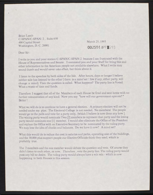 Letter to C-SPAN, 1993-03-25; 59301