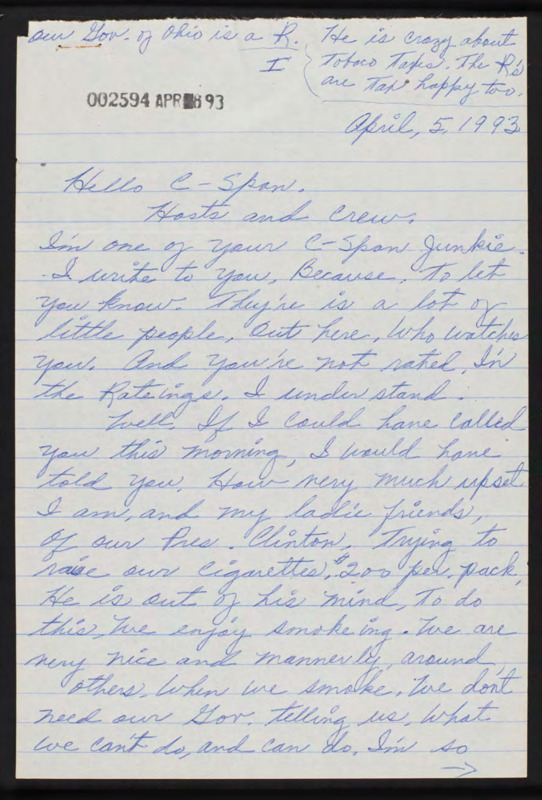 Expresses discontent with Clinton for trying to regulate smoking more with price increases, tighter laws, etc.