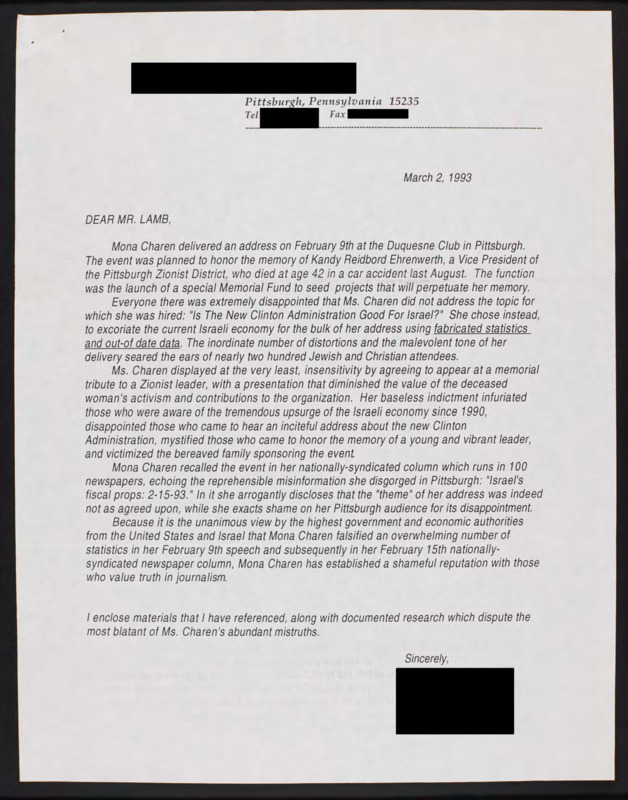 Expresses discontent with Mona Charen for giving speech at a memorial event for a Zionist activist that instead became a baseless presentation about outdated Israeli economics.
